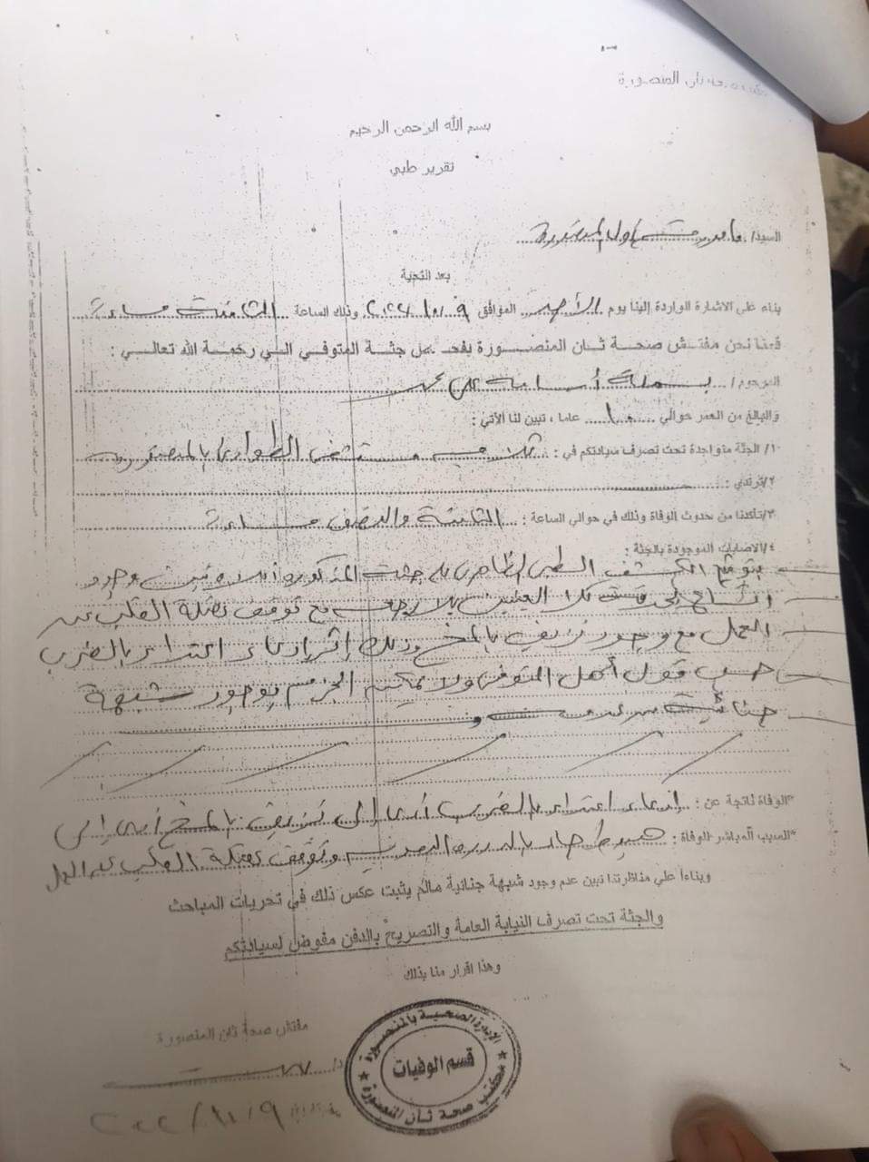 كشف التقرير الطبي للطالبة بسملة أسامة، ضحية الاعتداء على يد مدرس بأحد المدارس التابعة لمركز السنبلاوين في محافظة الدقهلية عن أن الإصابات الموجودة بالجثة بعد توقيع الكشف الطبي الظاهري: وجود اتساع بالحدقة بكلا العينين، مع توقف في عضلة القلب عن العمل مع وجود نزيف بالمخ، وذلك إثر ادعاء اعتداء بالضرب حسب قول أهل الطالبة، ولا يمكن الجزم بوجود شبهة جنائية من عدمه.