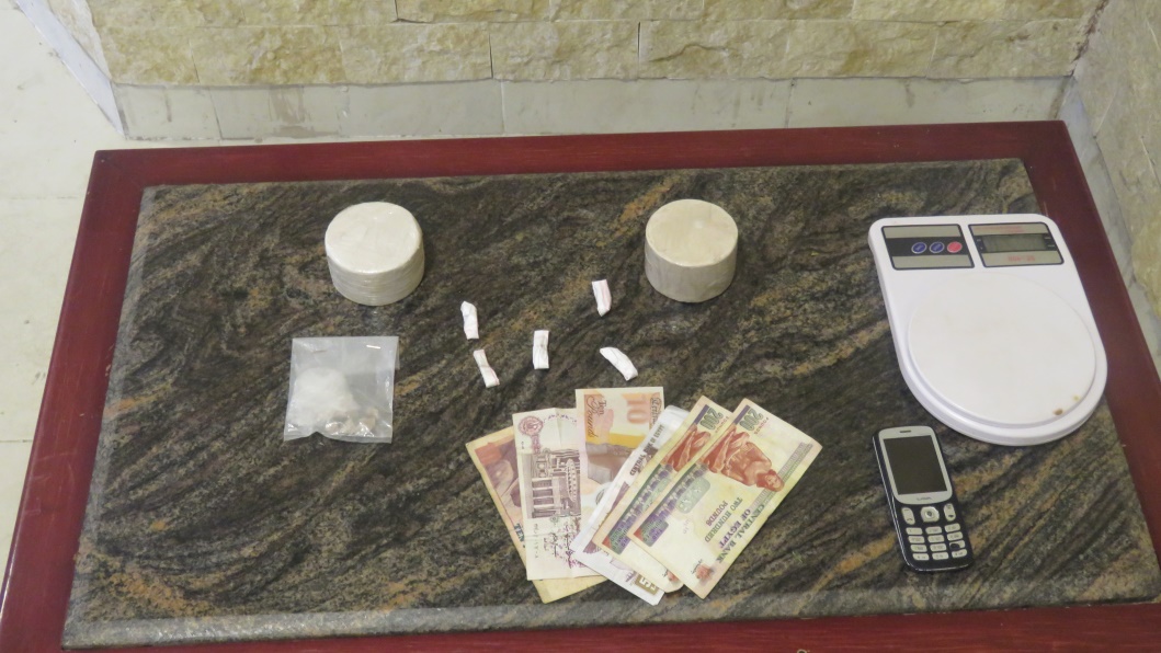وضبط أحد العناصر الإجرامية، له معلومات جنائية، مقيم بدائرة المركز، حال تواجده بمسكنه، وبحوزته كمية من مخدر الهيروين - مبلغ مالي - هاتف محمول - ميزان حساس.