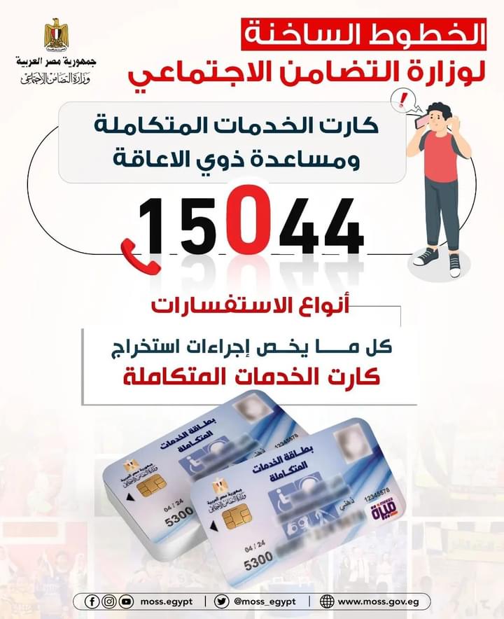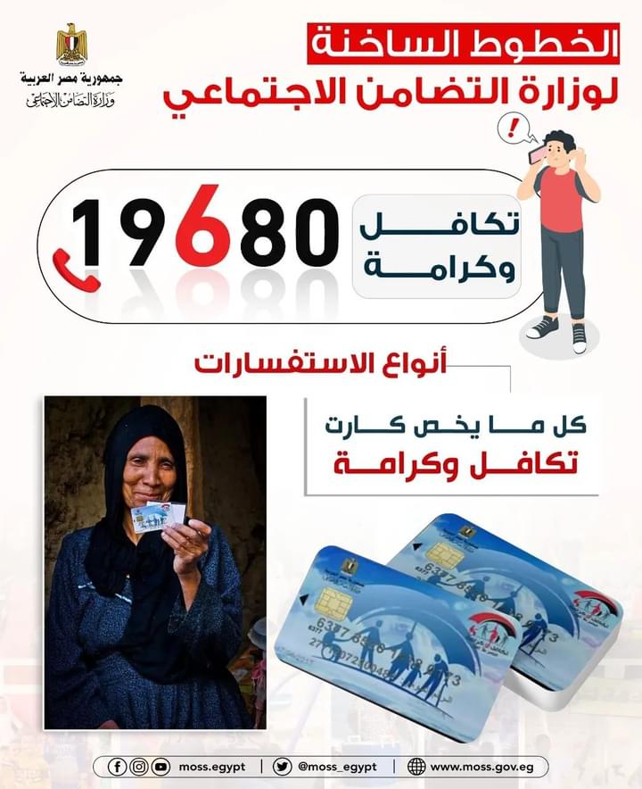 ويأتي الخط الساخن رقم 15044 لاستقبال الشكاوي الخاصة ببطاقة الخدمات المتكاملة، والخط الساخن رقم 19680 لاستقبال كافة أنواع الاستفسارات التي تخص تكافل وكرامة.