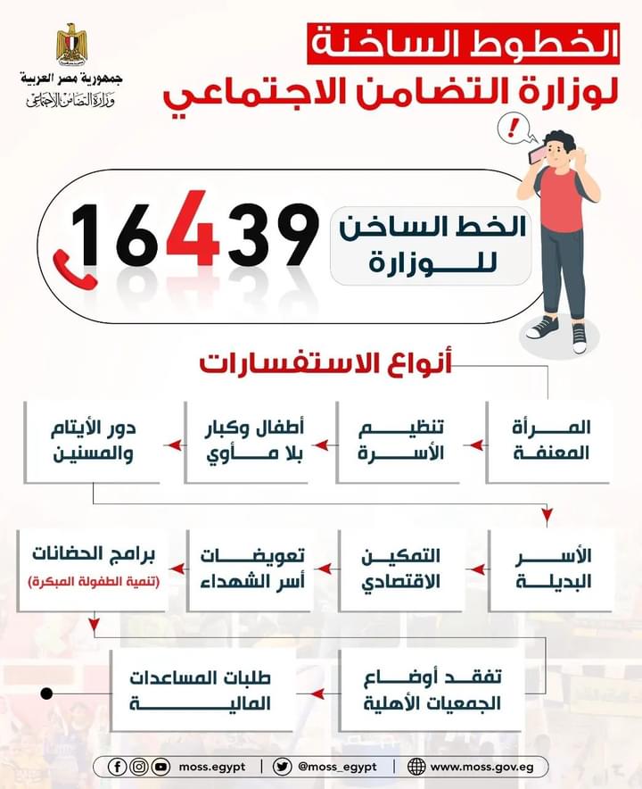 ونشرت وزارة التضامن الاجتماعي على صفحتها الرسمية بفيسبوك عددا من الأرقام الهامة لاستقبال شكاوى المواطنين حيث خصصت الوزارة الخط الساخن رقم 16439 لتلقي بلاغات أطفال وكبار بلا مأوى وتعويضات أسر الشهداء ودور الأيتام والمسنين والأسر البديلة وطلبات المساعدات المالية.