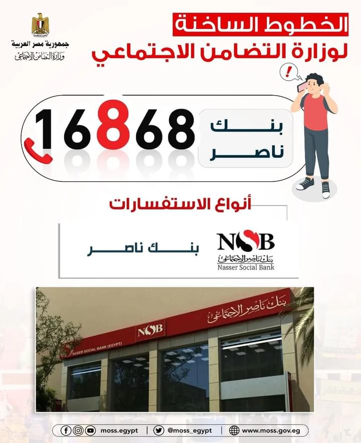 والرقم 19868 لاستقبال كافة الاستفسارات المتعلقة ببنك ناصر الاجتماعي.