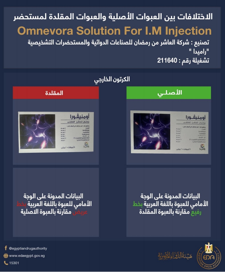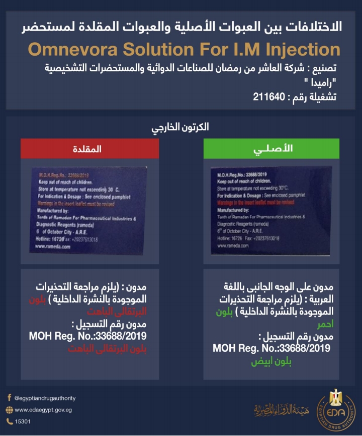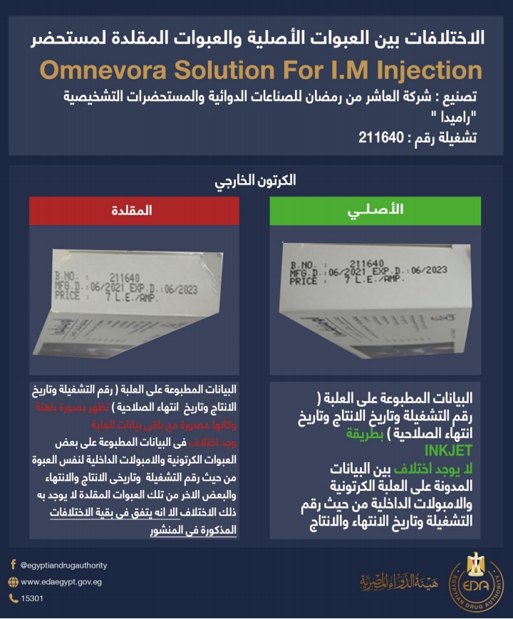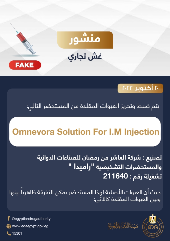 اصدرت هيئة الدواء المصرية منشور رقم ٢٦ لسنة ٢٠٢٢ للكشف عن غش تجاري لدواء Omnevora وأكدت أنه يتم ضبط وتحريز العبوات المقلدة من المستحضر: