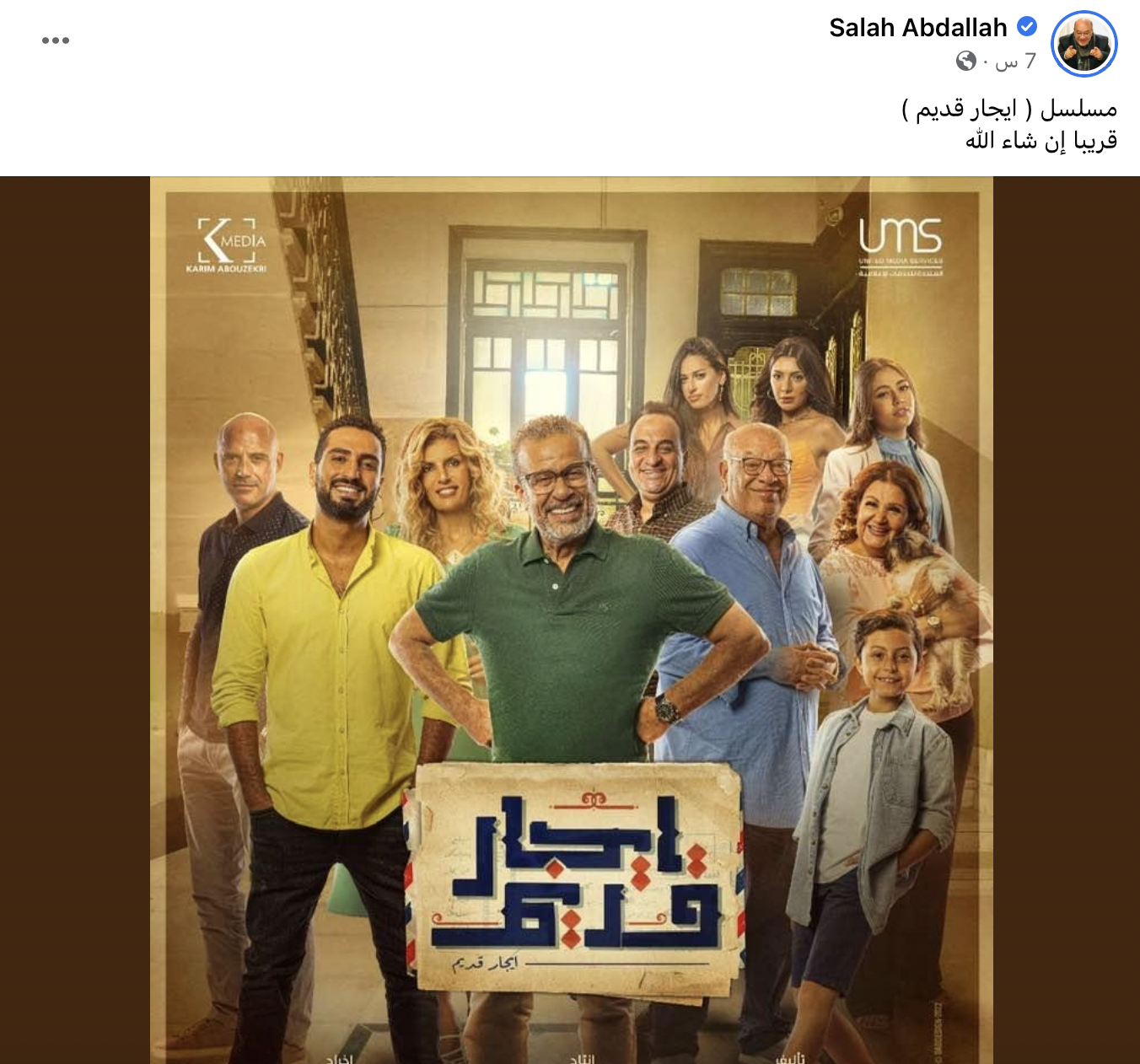 شوق الفنان صلاح عبد الله جمهوره لأحدث أعماله الفنية وهو مسلسل إيجار قديم حيث نشرت الصفحة الرسمية للفنان صلاح عبد الله عبر الفيس بوك بوستر المسلسل وأرفق صلاح عبد الله تعليق “ مسلسل (إيجار قديم) قريبًا إن شاء الله".