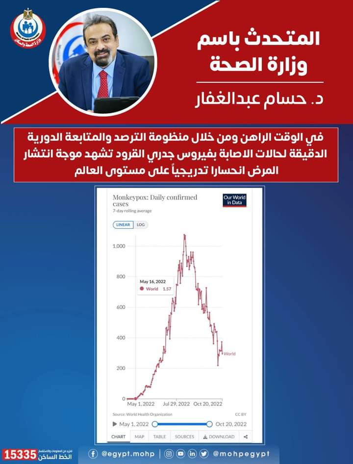 أكد الدكتور حسام عبد الغفار المتحدث الرسمي لوزارة الصحة أنه في الوقت الراهن ومن خلال منظومة الترصد والمتابعة الدورية الدقيقة لحالات الإصابة بفيروس جدري القرود، تشهد موجة انتشار المرض انحسارًا تدريجيًا على مستوى العالم.