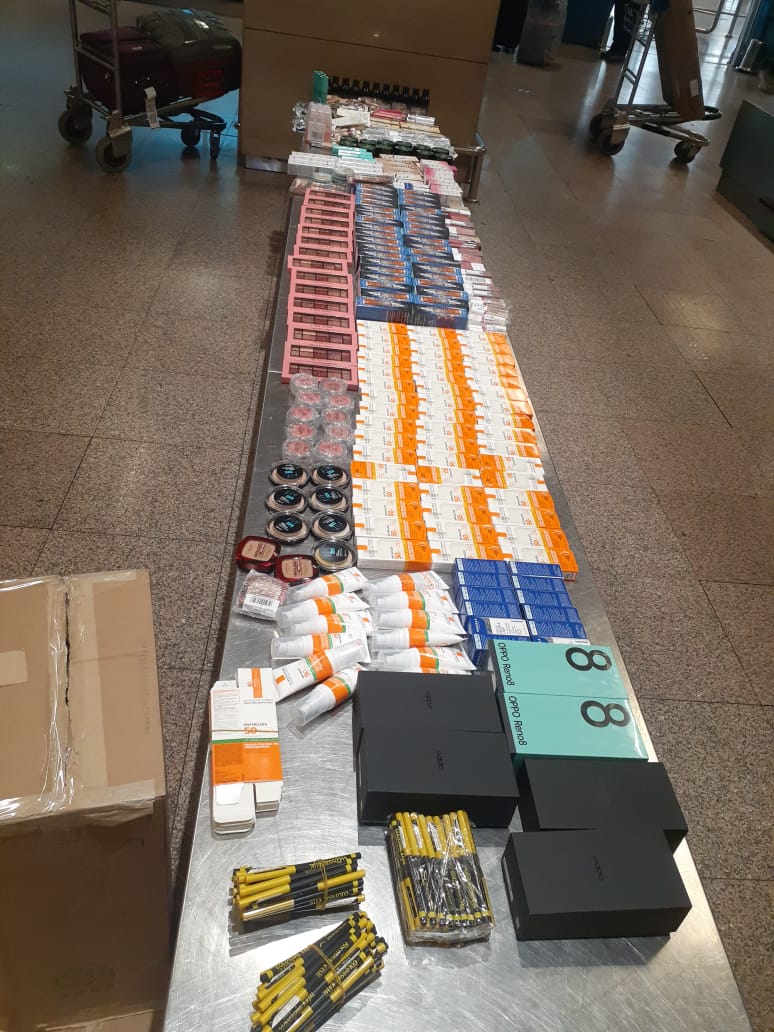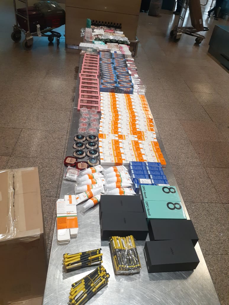 أحبطت سلطات جمارك مطار القاهرة الدولي برئاسة الدكتور ماجد موسي المدير العام ٥ محاولات تهريب في وقت متزامن لأربعة ركاب حاولوا تهريب تليفونات ثلاثة منهم أسفل الملابس التي يرتدونها وواحد داخل الحقائب، وراكبة حاولت تهريب كمية كبيرة من مستحضرات التجميل.