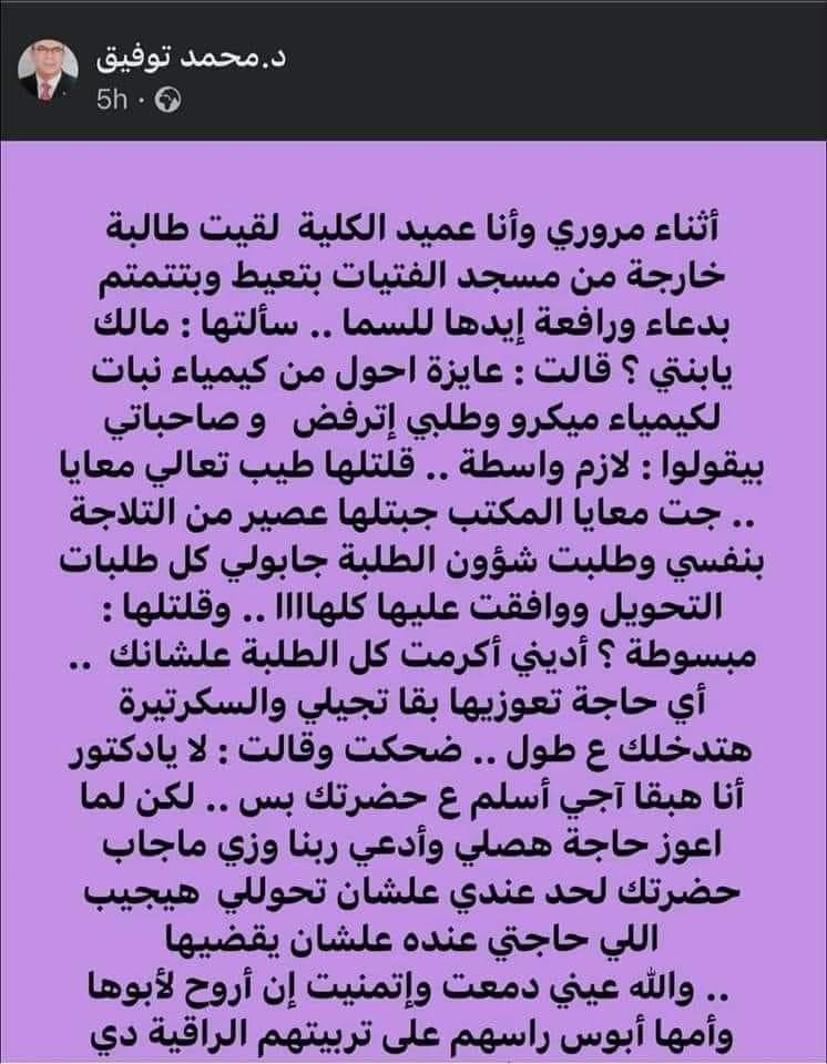 وجاء فى المنشور "أثناء مروري وأنا عميد الكلية لقيت طالبة خارجة من مسجد الفتيات بتعيط وبتتمتم بدعاء ورافعة إيدها للسما.. سألتها: مالك يابنتي ؟ قالت: عايزة احول من كيمياء نبات لكيمياء ميكرو وطلبي اترفض وصاحباتي بيقولوا: لازم واسطة.. قلتلها طيب تعالي معايا.. جت معايا المكتب جبتلها عصير من التلاجة بنفسي، وطلبت شئون الطلبة جابولي كل طلبات التحويل ووافقت عليها كلها".