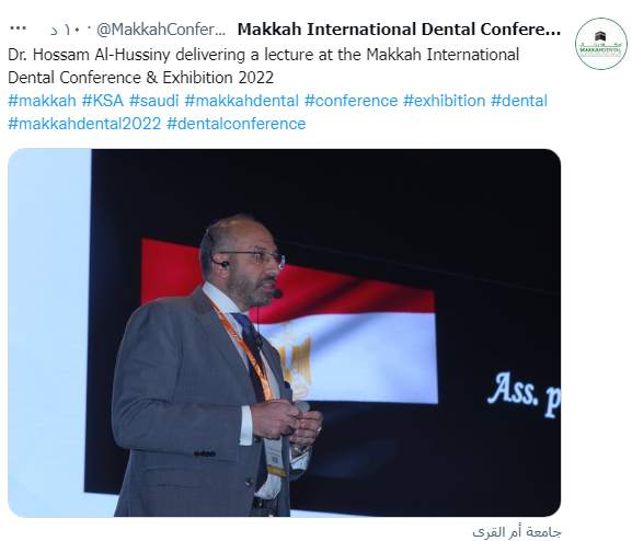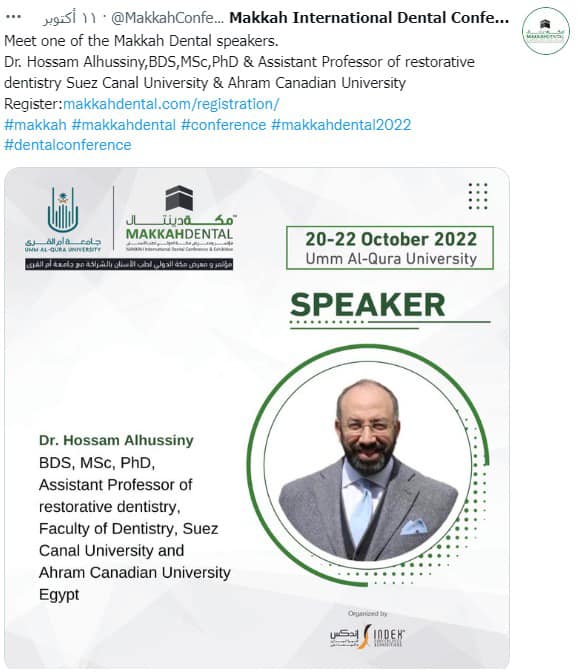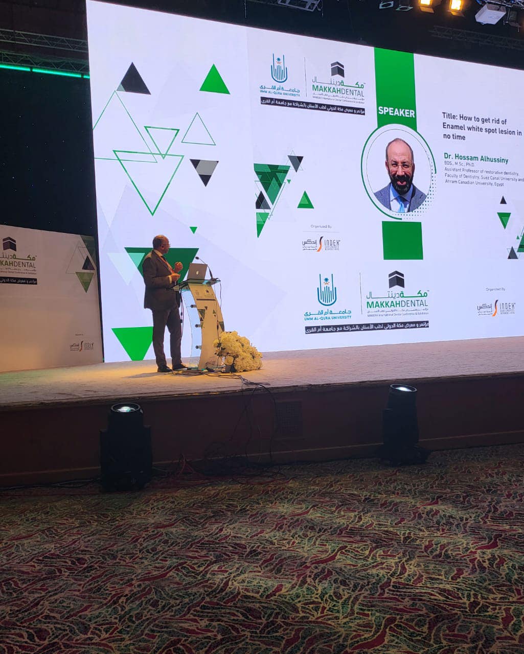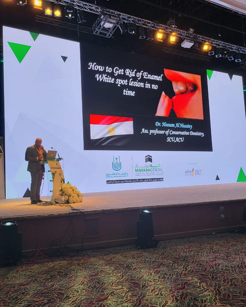 ويشارك الدكتور حسام المندوه في المؤتمر الذي يقام على مدار 3 أيام كمحاضر رئيسي، حيث ألقى محاضرة بعنوان:" كيفية التخلص من بقعة المينا البيضاء الموجودة بالأسنان في وقت قصير.. How to get rid of Enamel white spot lesion in no time "