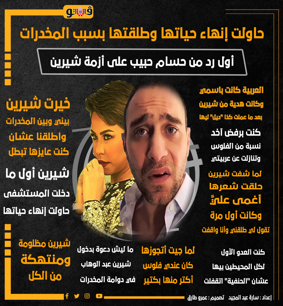 حاولت إنهاء حياتها وطلقتها بسبب المخدرات.. أول رد من حسام حبيب على أزمة شيرين | إنفوجراف السبت 22/أكتوبر/2022 - 01:28 ص 10/22/2022 1:28:28 AM شيرين وحسام حبيب سارة عبد المجيد شارك طباعة 18 حجم الخط شارك طباعة حسام حبيب شيرين عبد الوهاب شيرين أزمات شيرين أزمة شيرين عبد الوهاب وحسام حبيب