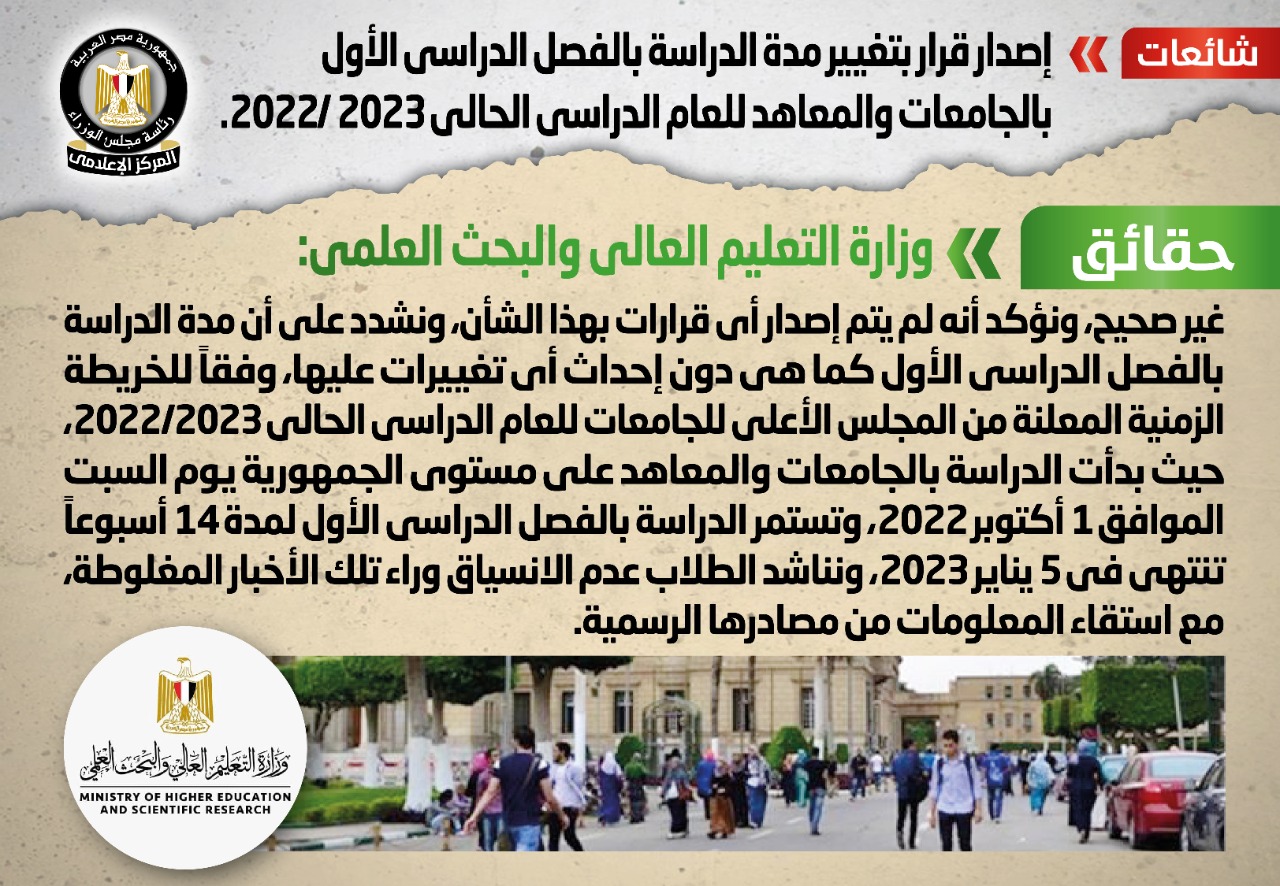 وبدأت الدراسة بالجامعات والمعاهد على مستوى الجمهورية يوم السبت الموافق 1 أكتوبر 2022، وتستمر الدراسة بالفصل الدراسي الأول لمدة 14 أسبوعًا تنتهي في 5 يناير 2023، مناشدةً الطلاب عدم الانسياق وراء تلك الأخبار المغلوطة، مع استقاء المعلومات من مصادرها الرسمية.