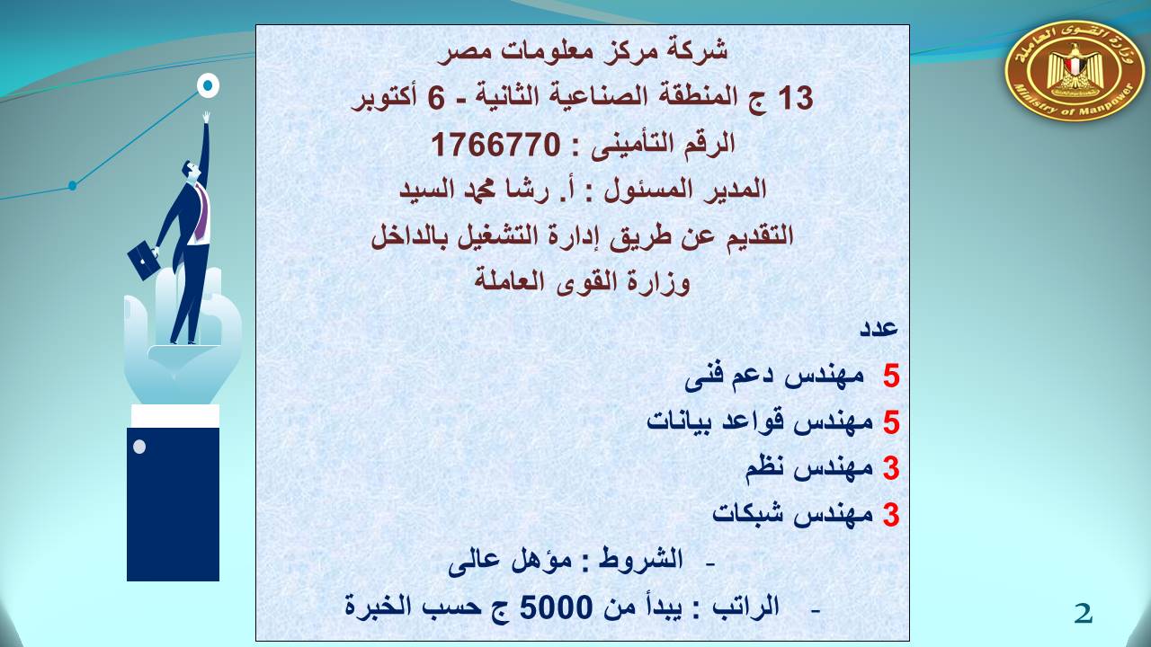 أعلنت إدارة التشغيل بالداخل بوزارة القوى العاملة،عن توفير 16 فرصة عمل للشباب خريجى كليات الهندسة من أقسام الدعم الفنى، وقواعد البيانات، والنظم والشبكات، وذلك للعمل بشركة مركز معلومات مصر بمدينة 6 أكتوبر بالمنطقة الصناعية الثانية، وذلك فى إطار جهود الوزارة لتوفير فرص عمل لائقة وحقيقية للشباب بمنشآت القطاع الخاص والاستثمارى بالمحافظات.