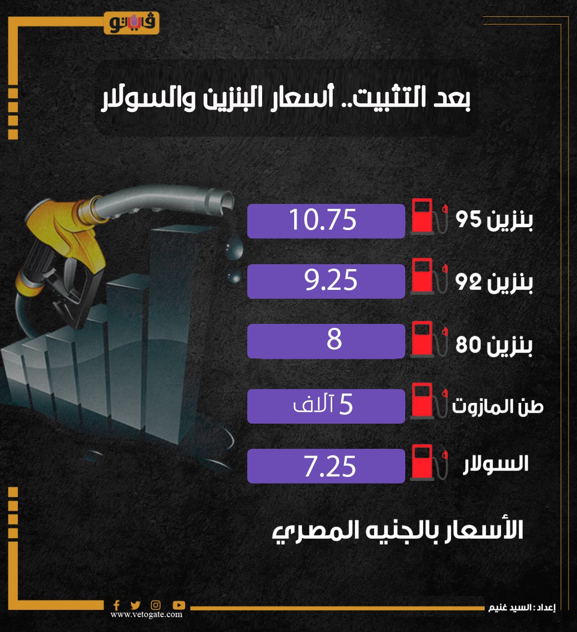 بعد التثبيت.. أسعار البنزين والسولار | انفوجراف السبت 22/أكتوبر/2022 - 03:41 م 10/22/2022 3:41:08 PM أسعار البنزين شارك طباعة 18 حجم الخط شارك طباعة