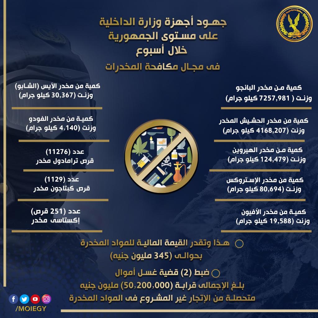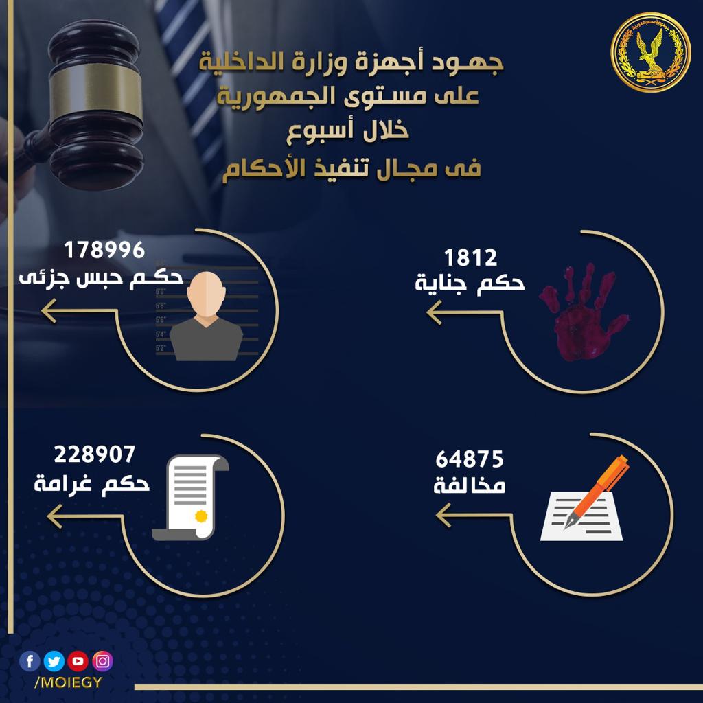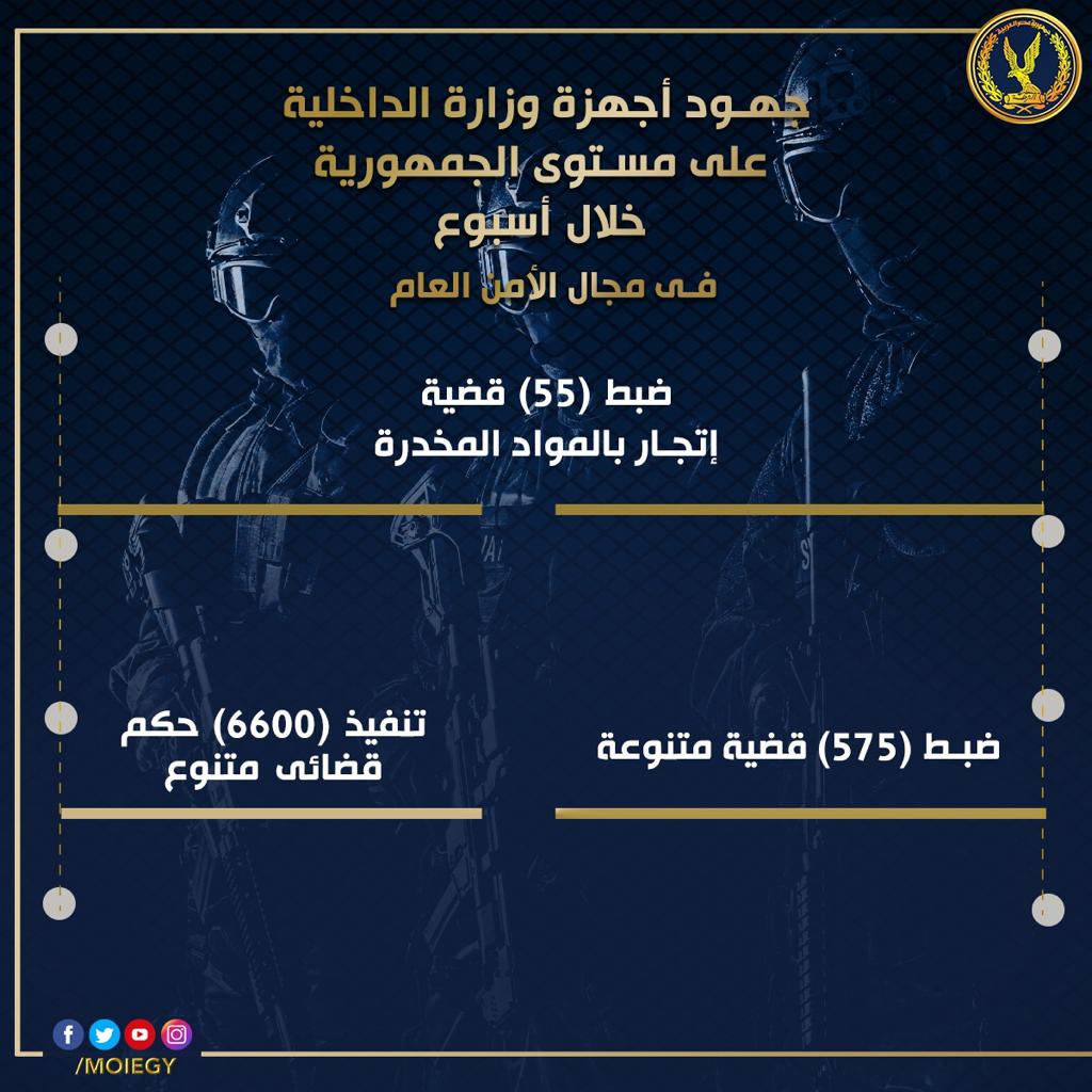 وأسفرت جهود ملاحقة العناصر الإجرامية خلال أسبوع عن ضبط 754 عنصر بنطاق مديريات أمن (الجيزة أسيوط – الغربية – الدقهلية – السويس – كفر الشيخ – دمياط – الشرقية – القليوبية – قنا – جنوب سيناء – الأقصر – البحر الأحمر – الإسكندرية – بورسعيد – المنيا – سوهاج – الوادى الجديد – المنوفية – أسوان – الإسماعيلية – الفيوم – مطروح – البحيرة – بنى سويف)، وبحوزتهم (302 قطعة سلاح نارى - عدد كبير من الطلقات مختلفة الأعيرة - كميات من المواد المخدرة المتنوعة) وجدير بالذكر أن عدد من المذكورين كان قد سبق اتهامهم فى العديد من القضايا أبرزها (قتل - سرقة – سلاح - مخدرات).