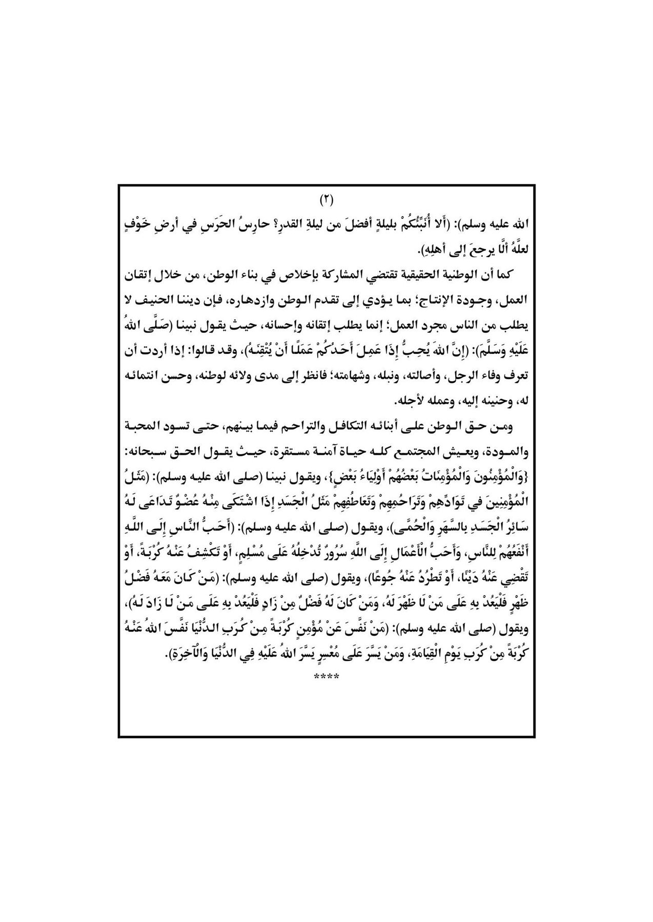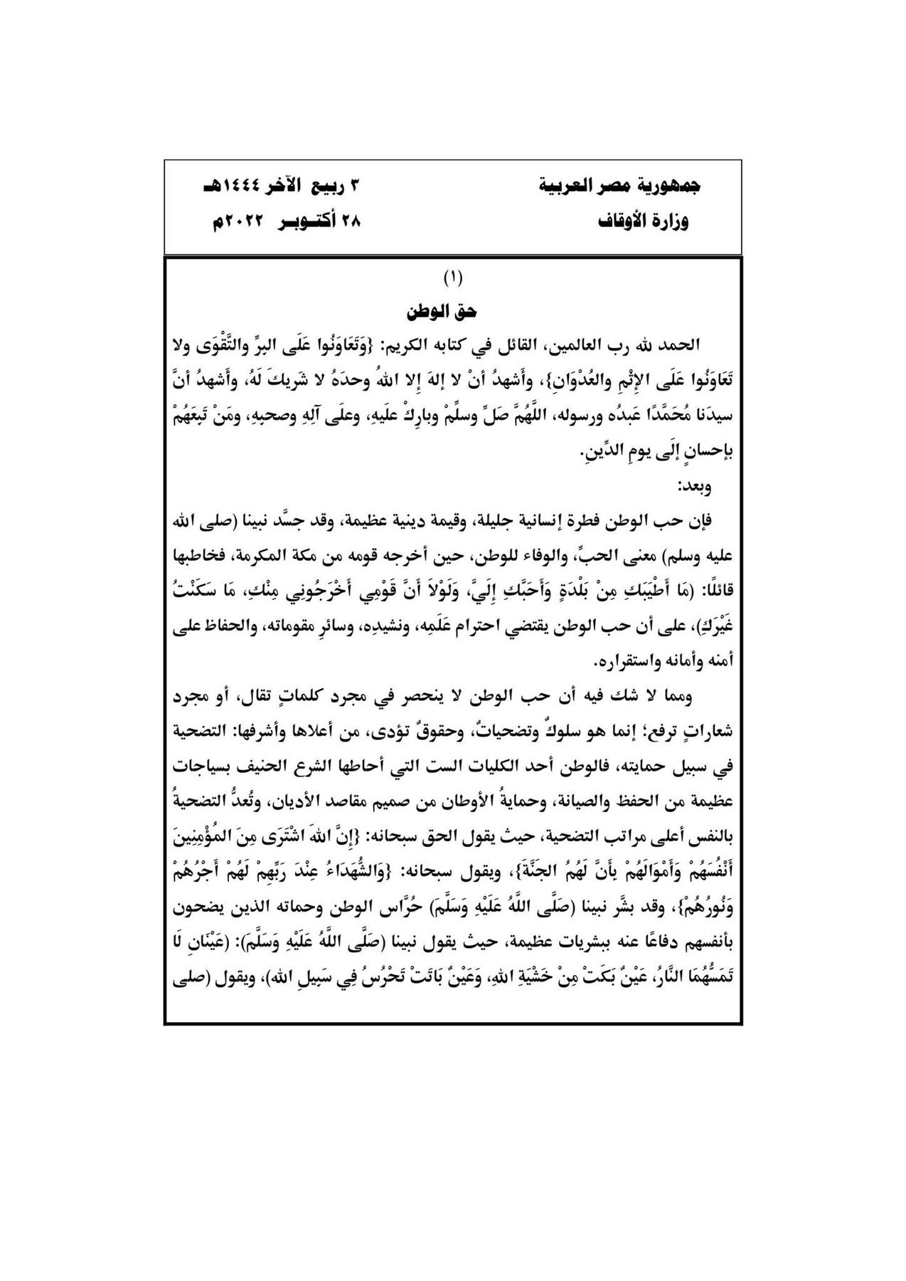 نشرت وزارة الأوقاف موضوع خطبة الجمعة القادمة 28 أكتوبر 2022م تحت عنوان: "حق الوطن".
