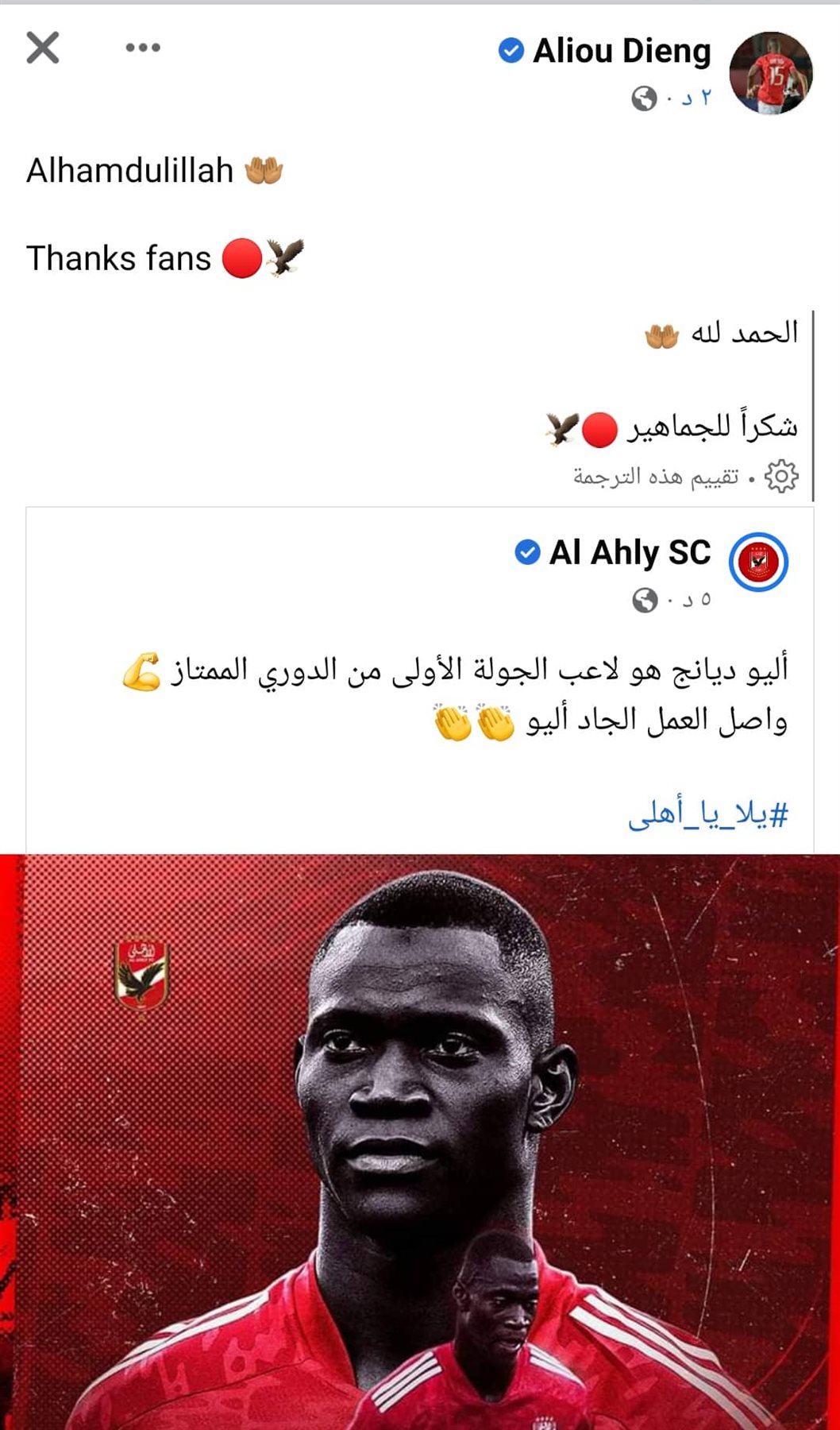 ونشر أليو ديانج عبر صفحته الرسمية: "شكرًا جماهير الأهلي.. الحمد لله".