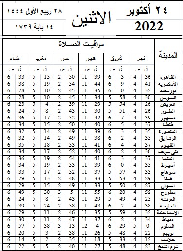 مواقيت الصلاة اليوم وفقًا للتوقيت المحلي لمدينتي القاهرة والإسكندرية وعدد من مدن ومحافظات الجمهورية من واقع بيانات الهيئة العامة للمساحة: