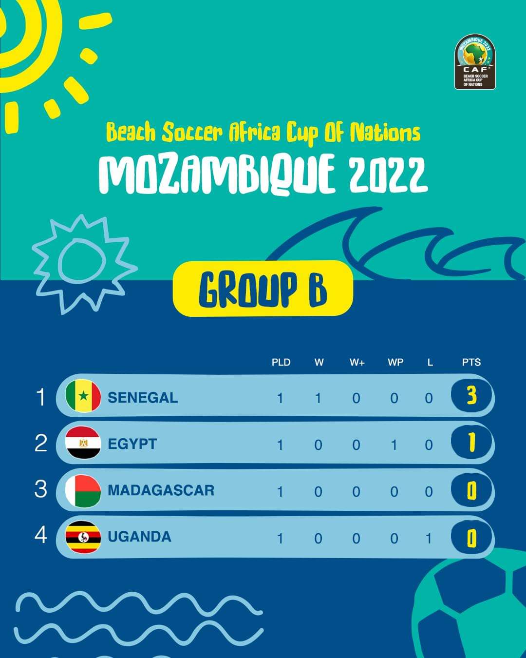 ويتصدر منتخب السنغال المجموعة الثانية برصيد 3 نقاط بعد الفوز على منتخب أوغندا بنتيجة 1/10 في المباراة التي جمعت الفريقين أمس السبت، بينما يأتي منتخب مصر في المركز الثاني برصيد نقطة بعد الفوز على مدغشقر بضربات الجزاء، وتأتي ترتيب المجموعة كالتالي: