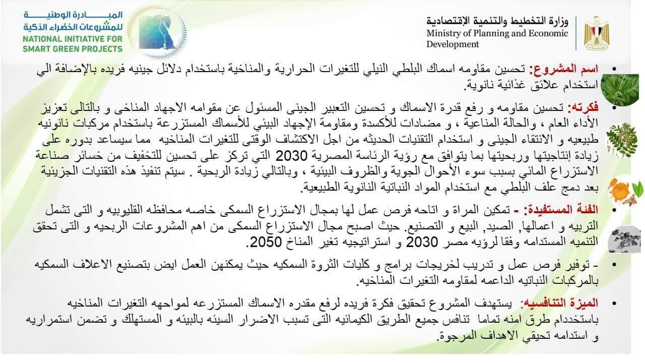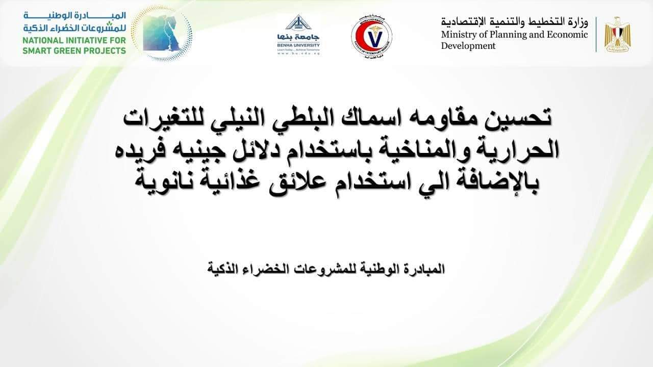 دخل مشروع تحسين مقاومة أسماك البلطي النيلي للتغيرات الحرارية والمناخية باستخدام دلائل جینیه فریده بالإضافة إلى استخدام علائق غذائية نانوية كأحد الدراسات والمشروعات في محافظة القليوبية ضمن المشروعات الذكية الخضراء التي أطلقتها وزارة التخطيط تزامنا مع قمة المناخ بشرم الشيخ ضمن فئة المشروعات التنموية المتعلقة بالمرأة وتغير المناخ والاستدامة.