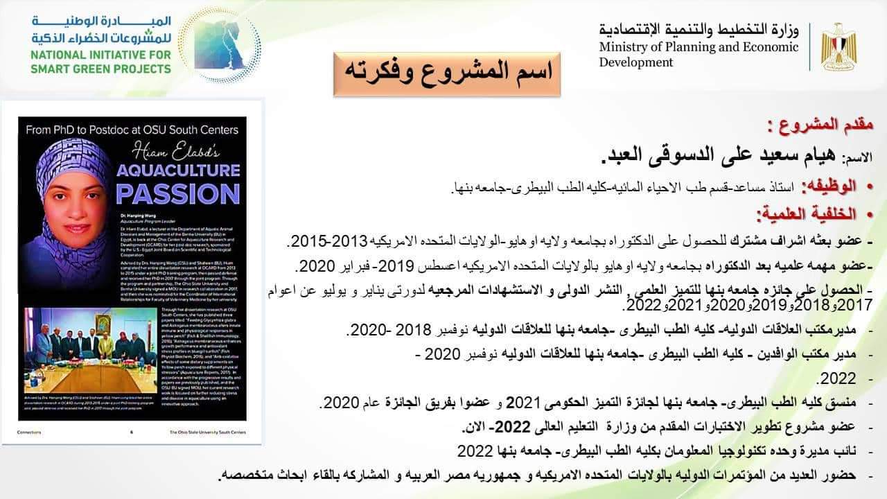 المشروع من إعداد الدكتورة هيام سعيد على الدسوقى العبد أستاذ مساعد قسم طب الأحياء المائية بكلية الطب البيطري بجامعة بنها وعضو بعثة إشراف مشترك للحصول على الدكتوراه جامعة ولاية أوهايو الولايات المتحدة الأمريكية ومدير مكتب العلاقات الدولية بكلية الطب البيطري بجامعة بنهاو ومنسق كلية الطب البيطري جامعة بنها لجائزة التميز الحكومي.