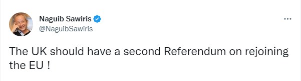 وكتب مهندس نجيب ساويرس تغريدة على تويتر "يتعين على المملكة المتحدة إجراء استفتاء ثان حول الانضمام إلى الاتحاد الأوروبي!"