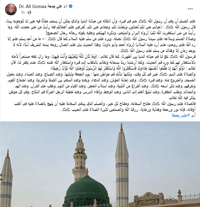وكتب الدكتور علي جمعة تدوينة على الفيس بوك "على المسلم أن يعلم أن رسول الله ﷺ حي في قبره، وأن انتقاله من حياتنا الدنيا والذي يمكن أن يسمى مماتًا فيه خير لنا كوجوده بيننا، قال رسول الله ﷺ: (حياتي خير لكم تُحدثون ويَحْدُث لكم. ومماتي خير لكم، تُعرض علي أعمالكم فما رأيتُ من خير حمدت الله، وما رأيتُ من شر استغفرت الله لكم) [رواه البزار والديلمي، وذكره الهيثمي وعقبه بقوله رجاله رجال الصحيح]