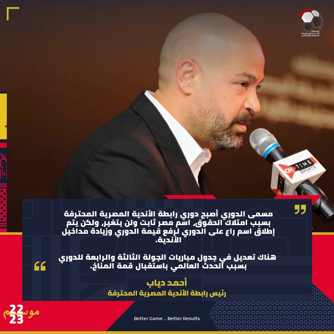 أعلن أحمد دياب رئيس رابطة الأندية المصرية المحترفة عن تعديل في جدول مباريات الجولة الثالثة والرابعة للدوري الممتاز بسبب الحدث العالمي باستقبال قمة المناخ.