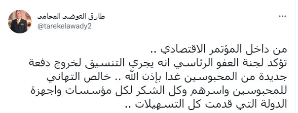 وكتب طارق العوضي تغريدة على تويتر "من داخل المؤتمر الاقتصادي.. تؤكد لجنة العفو الرئاسي انه يجري التنسيق لخروج دفعة جديدةً من المحبوسين غدا بإذن الله.. خالص التهاني للمحبوسين واسرهم وكل الشكر لكل مؤسسات واجهزة الدولة التي قدمت كل التسهيلات..".