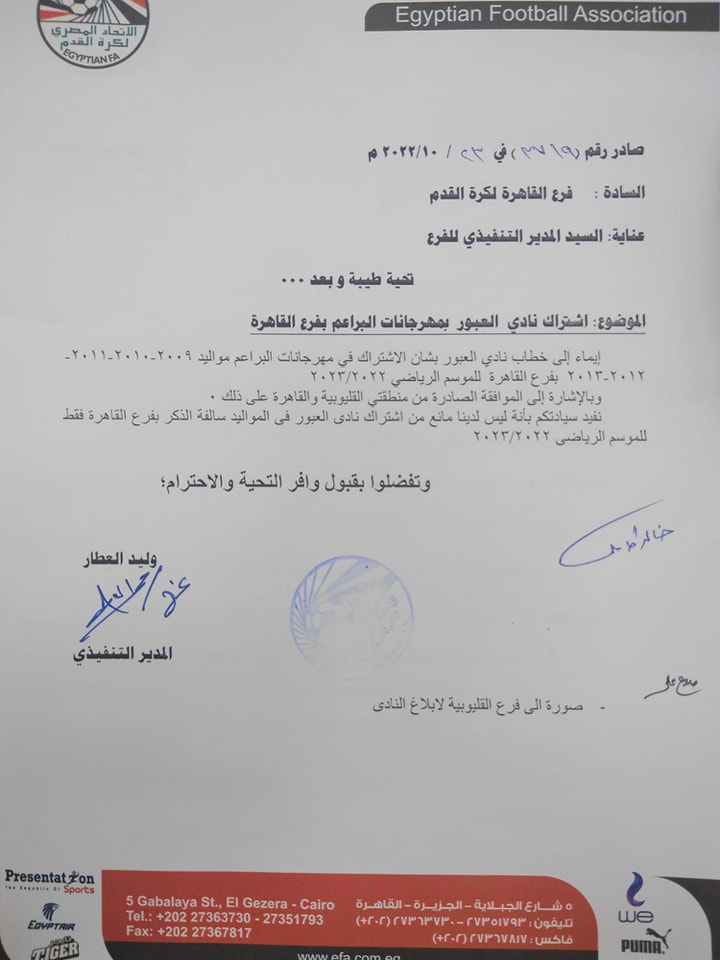 وافق اتحاد الكرة علي طلب نادي العبور للمشاركة في مهرجان القاهرة للبراعم لموسم 2022-2023