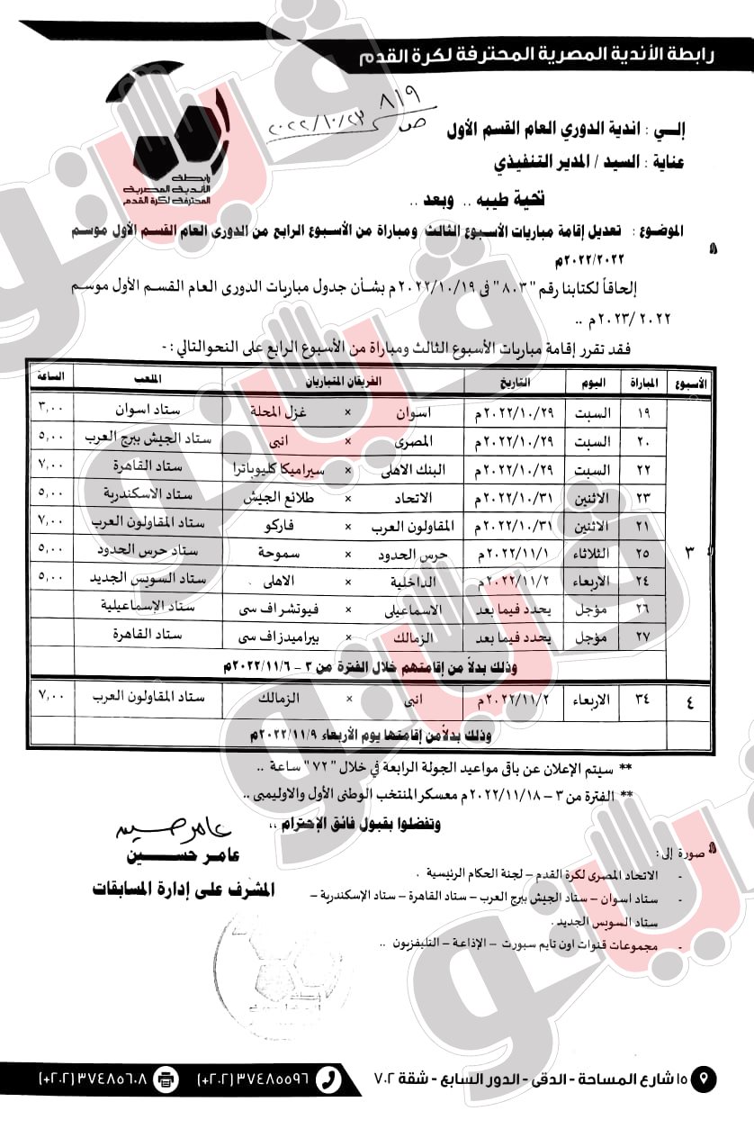 أعلنت لجنة المسابقات باتحاد كرة القدم برئاسة عامر حسين، أول تعديل في جدول الدوري الممتاز للموسم الحالي والذي تم إعلانه قبل انطلاق الموسم.