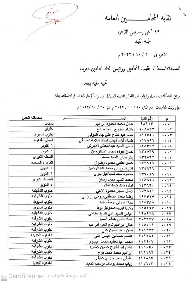 أخطرت لجنة القيد بالنقابة العامة للمحامين، عبد الحليم علام، نقيب المحامين، رئيس اتحاد المحامين العرب، بأنه تنفيذًا لأحكام قانون المحاماة المادة (12)، وبناء على البحث في مخالفات التأمينات عن قطاعي التأمين «قطاع الأعمال العام والخاص» و«القطاع الحكومي»، تم إسقاط القيد عن 794 عضوًا في الفترة من 1 حتى 20 أكتوبر الجاري، حيث وضحت نتيجة الفحص في برنت التأمينات الخاصة بكل منهم عملهم بعمل غير مهنة المحاماة.