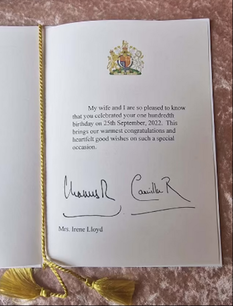 وتنص الرسالة، التي وقعها كل من "تشارلز آر" و"كاميلا آر"، على ما يلي: "أنا وزوجتي سعداء للغاية بمعرفة أنك احتفلت بعيد ميلادك المائة. وهذا يجلب لنا أحر التهاني وأطيب التمنيات الصادقة في مثل هذه المناسبة الخاصة.