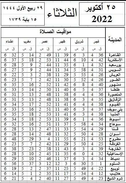 مواقيت الصلاة اليوم وفقًا للتوقيت المحلي لمدينتي القاهرة والإسكندرية وعدد من مدن ومحافظات الجمهورية من واقع بيانات الهيئة العامة للمساحة: