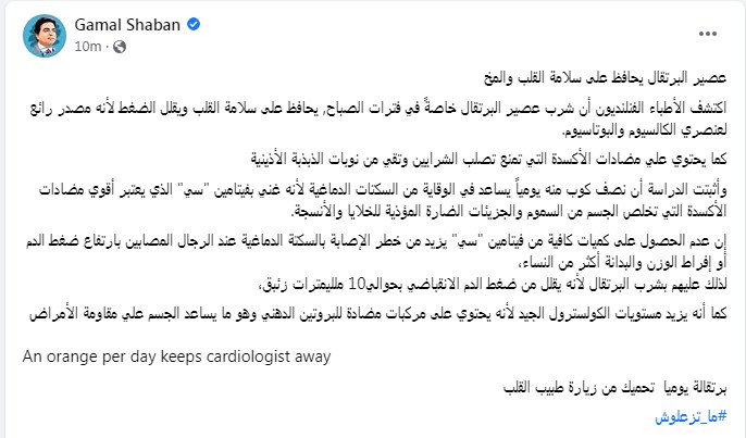 وكتب جمال شعبان تدوينة على الفيس بوك قال فيها: "عصير البرتقال يحافظ على سلامة القلب والمخ.. اكتشف الأطباء الفنلنديون أن شرب عصير البرتقال خاصةً في فترات الصباح، يحافظ على سلامة القلب ويقلل الضغط لأنه مصدر رائع لعنصري الكالسيوم والبوتاسيوم. كما يحتوي على مضادات الأكسدة التي تمنع تصلب الشرايين وتقي من نوبات الذبذبة الأذينية..