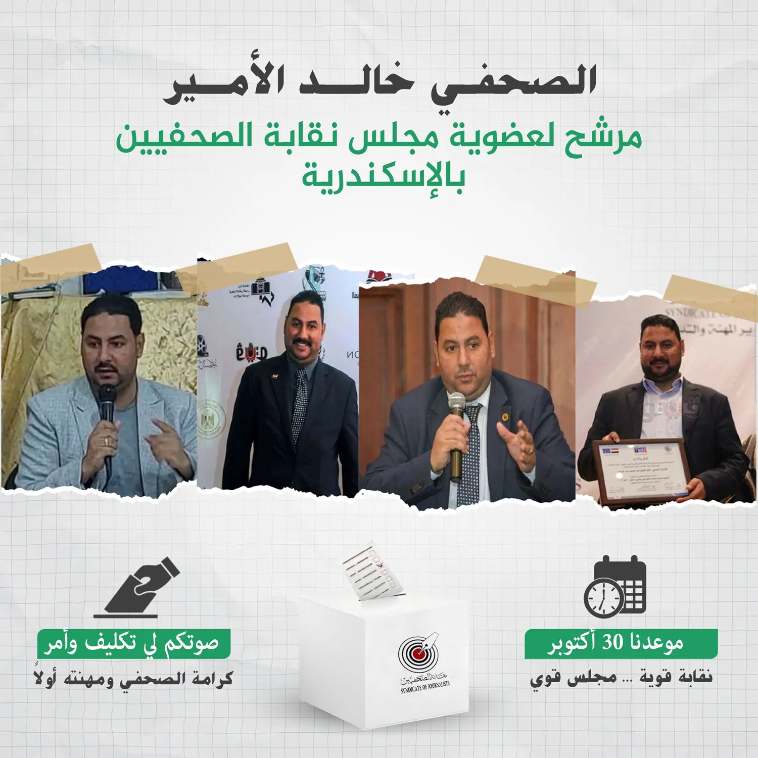 يخوض الزميل خالد الأمير، مدير مكتب جريدة فيتو بالإسكندرية، انتخابات التجديد النصفي بنقابة الصحفيين الفرعية، والتي من المقرر اجرائها ٣٠ أكتوبر، معتمدا علي رصيد كبير من الخدمات السابقة من قبل حتي قبل أن يفكر في الترشح لانتخابات النقابة، وبدعم من الشباب وشيوخ المهنه، مقدما برنامج يشتمل علي عده محاور خدمية وترفيهية وتدريبية وحماية الصحفيين.