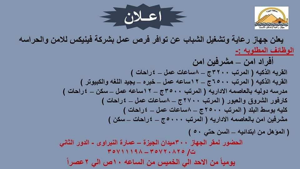 أعلن جهاز رعاية وتشغيل الشباب بمحافظة الجيزة توافر فرص عمل للشباب شملت أفراد أمن، ومشرفين أمن في إحدى شركات الأمن والحراسة، وأوضح الجهاز الشروط المطلوبة لهذه الوظائف وهي أن يكون المتقدم حاصل على المؤهل من الابتدائية، ولا يزيد عمره على 50 عامًا.