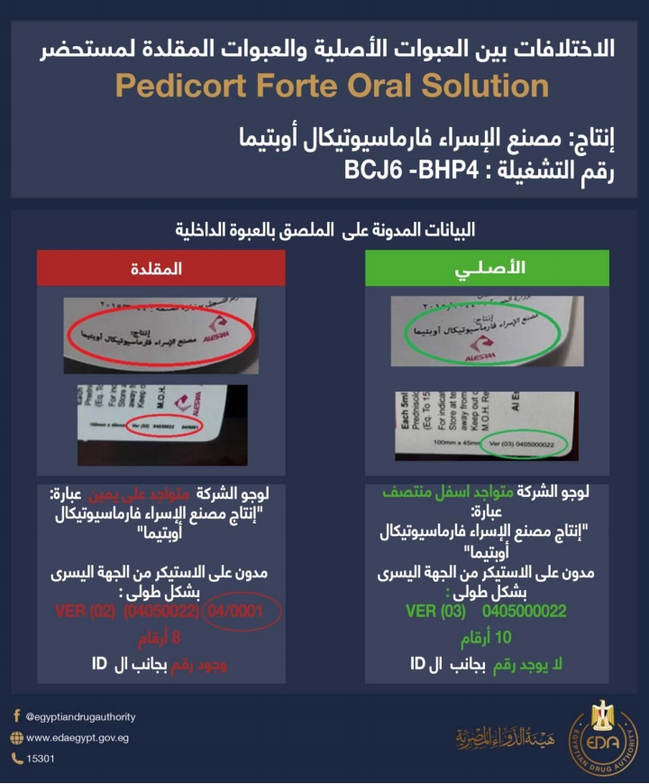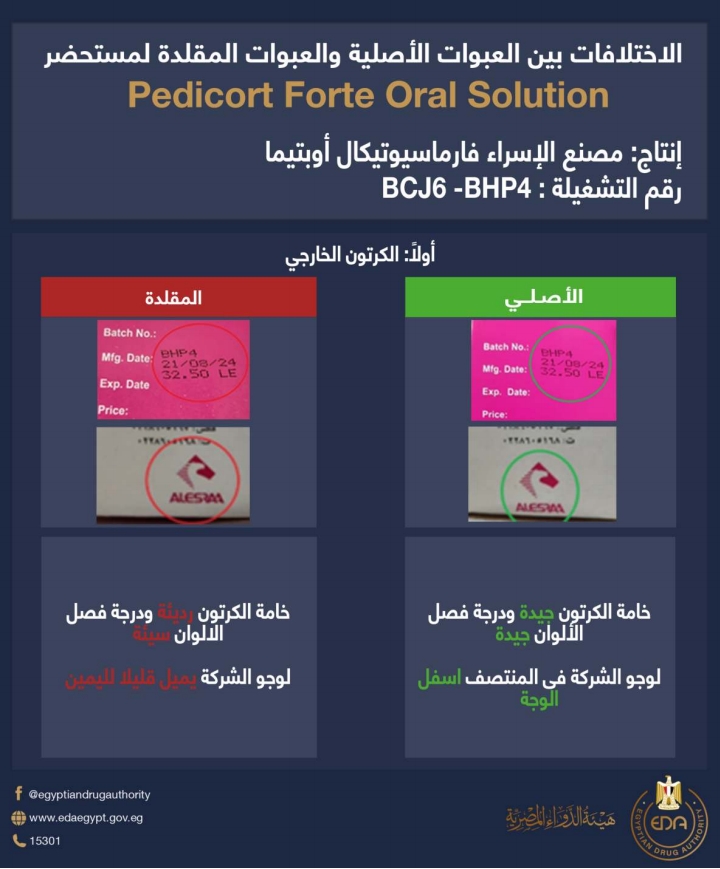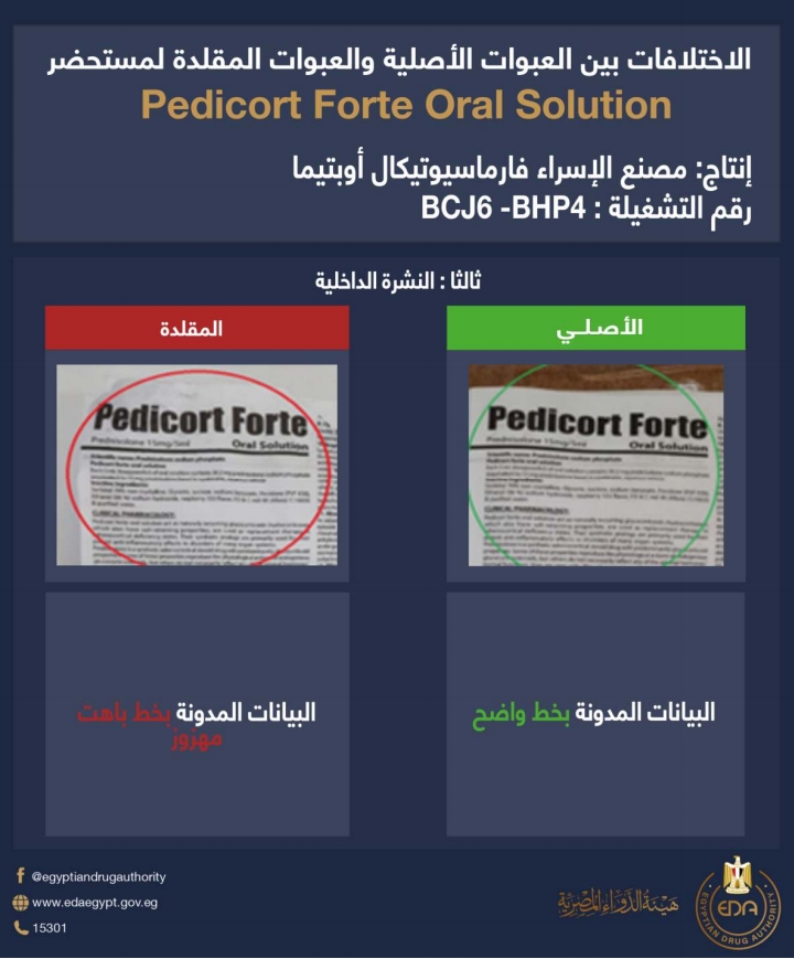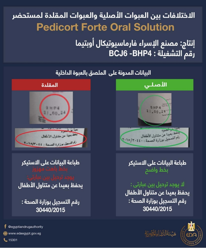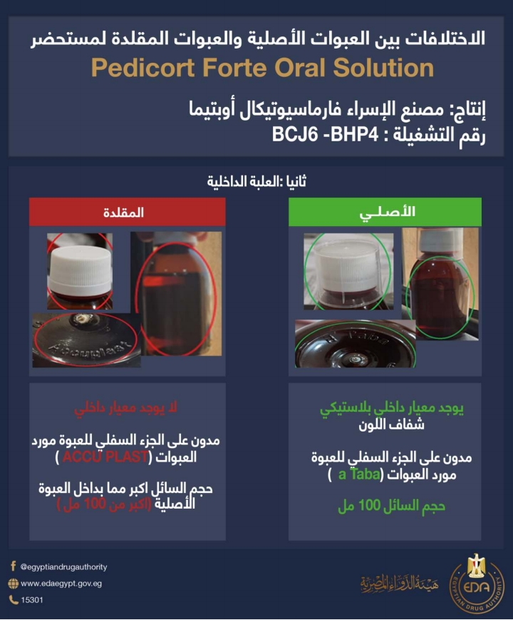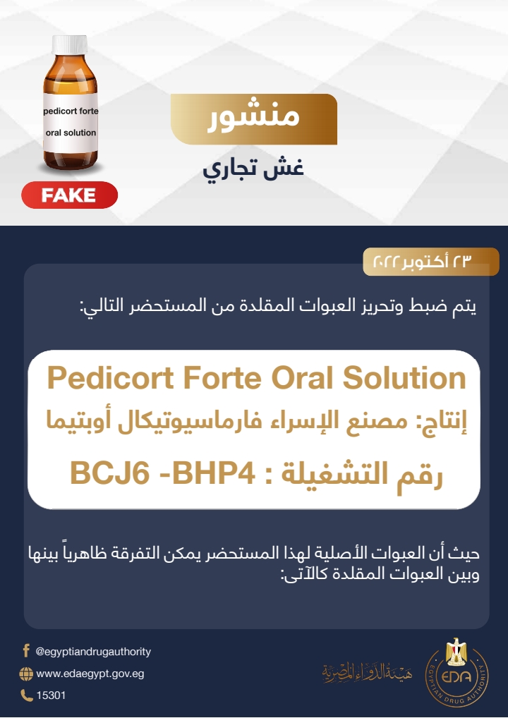 أصدرت هيئة الدواء المصرية منشور غش تجاري بشأن ضبط دواء Pedicort مطالبة بأن يتم ضبط وتحريز العبوات المقلدة من المستحضر: