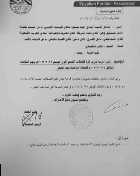 تجري لجنة المسابقات باتحاد الكرة المصري اليوم الثلاثاء، في الواحدة ظهرا قرعة دوري كرة الصالات، للموسم الجديد 2022 - 2023.