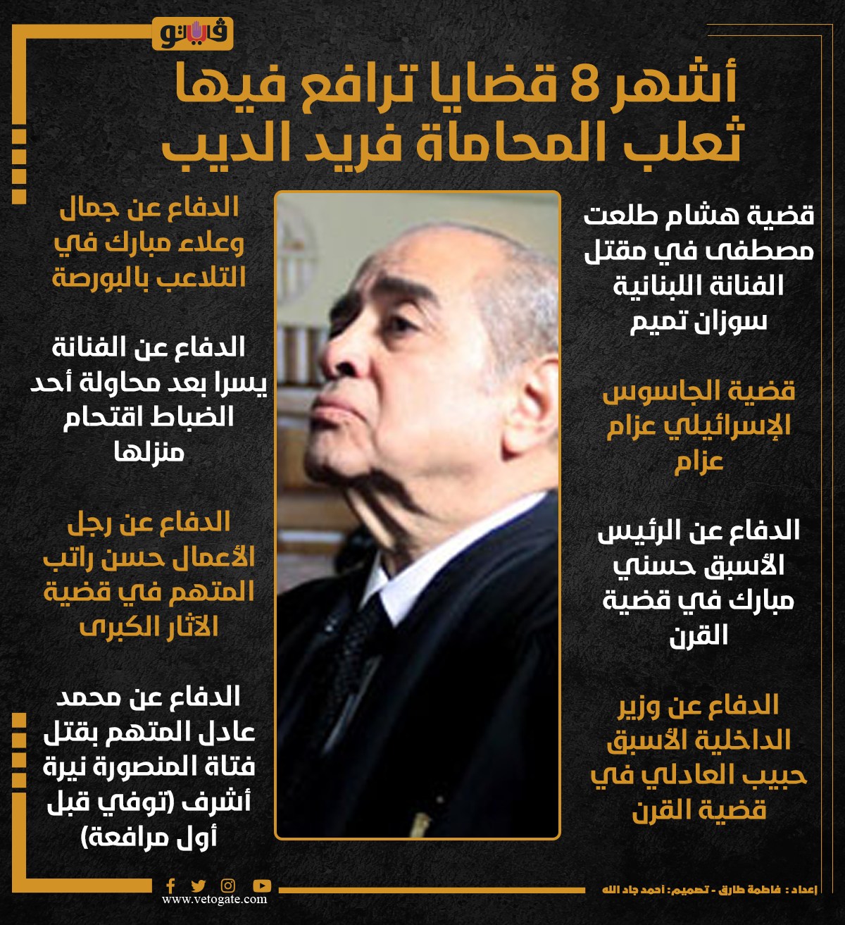 أشهر 8 قضايا ترافع فيها ثعلب المحاماة فريد الديب| إنفوجراف الثلاثاء 25/أكتوبر/2022 - 11:34 ص 10/25/2022 11:34:10 AM فريد الديب فاطمة طارق شارك طباعة 18 حجم الخط شارك طباعة التلاعب بالبورصة الرئيس الأسبق حسنى مبارك الاثار الكبري اقتحام منزل الفنانة اللبنانية سوزان تميم هشام طلعت مصطفى حبيب العادلى وفاة فريد الديب