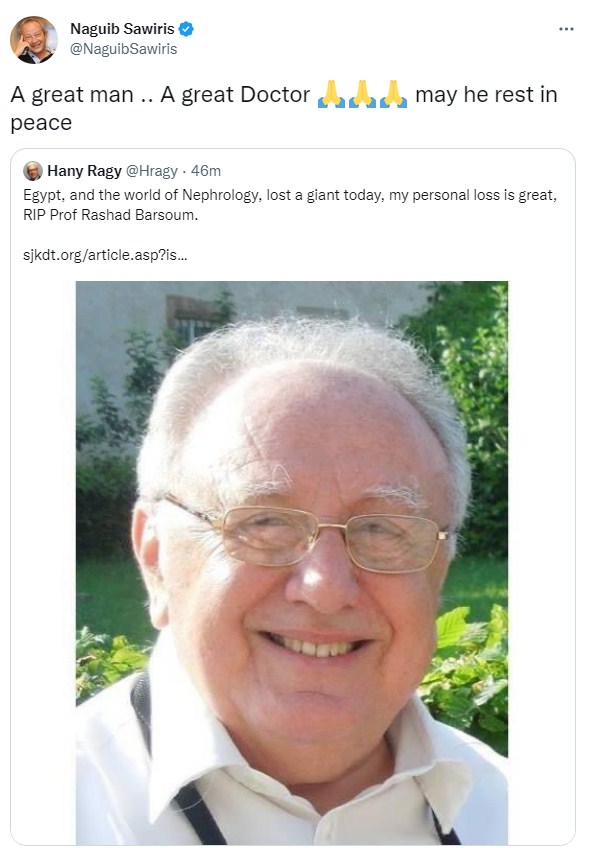 وكتب نجيب ساويرس تغريدة على تويتر قال فيها: "رجل عظيم.. ودكتور عظيم.. فلترقد روحه في سلام".