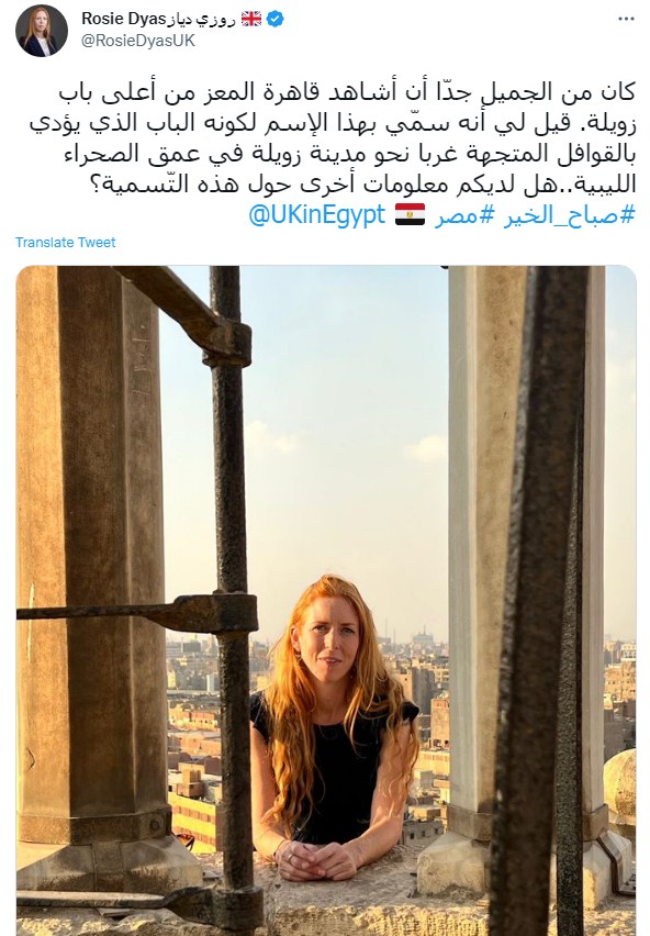 وكتبت روزي دياز تغريدة على تويتر “ قالت فيها: ”كان من الجميل جدّا أن أشاهد قاهرة المعز من أعلى باب زويلة. قيل لي أنه سمّي بهذا الاسم لكونه الباب الذي يؤدي بالقوافل المتجهة غربا نحو مدينة زويلة في عمق الصحراء الليبية..هل لديكم معلومات أخرى حول هذه التسمية؟ #صباح_الخير #مصر"