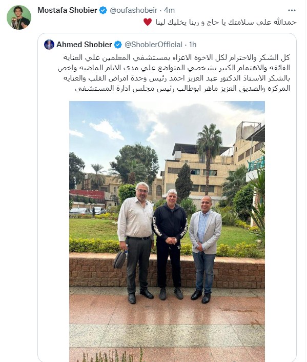 وذلك ردًا على رسالة والده أحمد شوبير، التي وجهها لإدارة مستشفى المعلمين بعد تعافيه من وعكته الصحية، قائلا: "كل الشكر والاحترام لكل الاخوه الاعزاء بمستشفي المعلمين علي العنايه الفائقه والاهتمام الكبير بشخصي المتواضع علي مدى الايام الماضيه وأخص بالشكر الدكتور عبد العزيز أحمد رئيس وحدة أمراض القلب والعناية المركزة والصديق العزيز ماهر أبو طالب رئيس مجلس ادارة المستشفي".