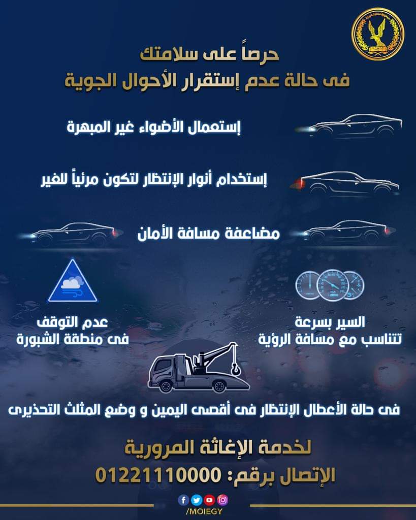 وأضاف المصدر بأن كلف اللواء محمود توفيق وزير الداخلية، الأجهزة المرورية والأمنية والحماية المدنية التنسيق مع الجهات المعنية لمواجهة تداعيات التغيرات الجوية وهطول الأمطار للحد من آثارها مع تسيير الحركة المرورية بكافة الطرق ومنع التكدسات.
