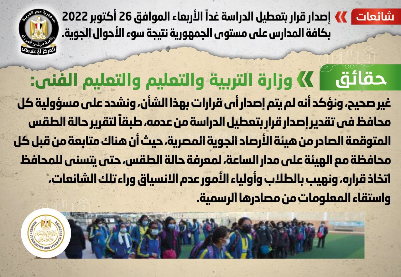 وأكدت وزارة التعليم أنه لا صحة لتعطيل الدراسة غدًا الأربعاء الموافق ٢٦ أكتوبر ٢٠٢٢ بكافة المدارس على مستوى الجمهورية نتيجة سوء الأحوال الجوية، وأنه لم يتم إصدار أي قرارات بهذا الشأن.