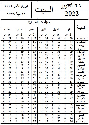 مواقيت الصلاة اليوم وفقًا للتوقيت المحلي لمدينتي القاهرة والإسكندرية وعدد من مدن ومحافظات الجمهورية من واقع بيانات الهيئة العامة للمساحة: