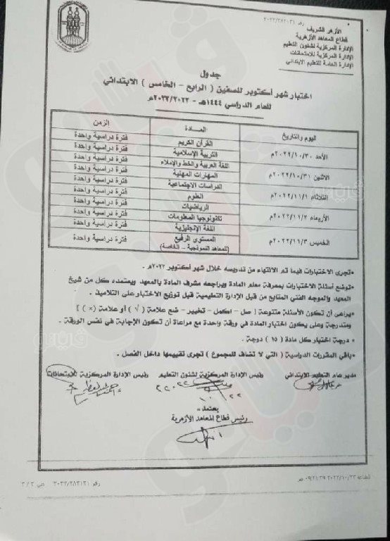 يستعد طلاب الصفين الرابع والخامس الابتدائي بالمعاهد الأزهرية لعقد الاختبارات الشهرية المقرر أن تقام يوم الأحد المقبل 2022/10/30.