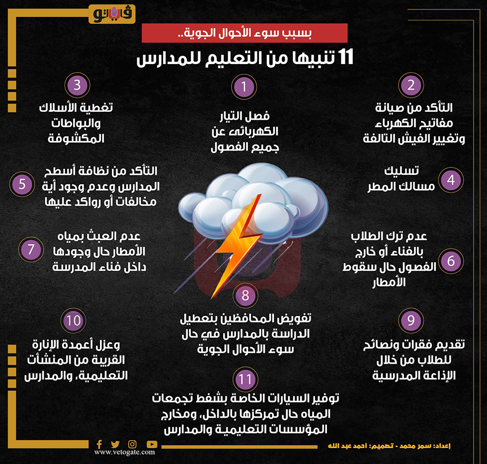 بسبب سوء الأحوال الجوية.. 11 تنبيها من التعليم للمدارس|انفوجراف الأربعاء 26/أكتوبر/2022 - 08:29 م 10/26/2022 8:29:39 PM طلاب المدارس سمر محمد شارك طباعة 18 حجم الخط شارك طباعة وية فصل التيار الكهربائي وزارة التربية والتعليم مياه الأمطار سقوط الأمطار الإذاعة المدرسية