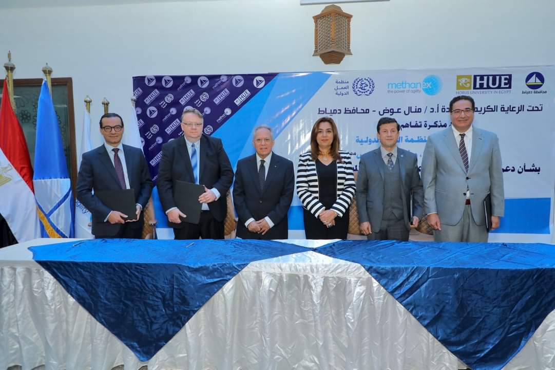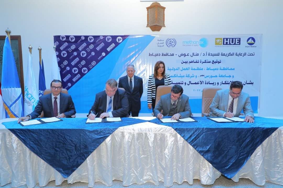 ووقع على المذكرة اللواء محمد همام سكرتير عام المحافظة وإيريك أوشلان مدير مكتب منظمة العمل الدولية بالقاهرة والدكتور السعيد عبد الهادي رئيس جامعة حورس ومحمد شندي الرئيس التنفيذي والعضو المنتدب لشركة ميثانكس لإنتاج الميثانول...