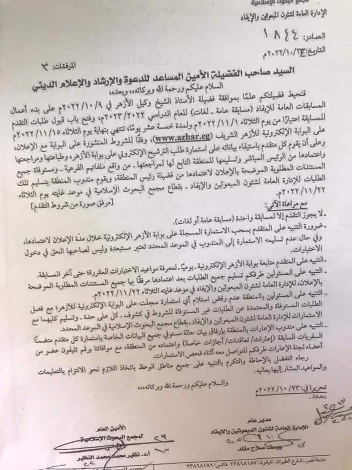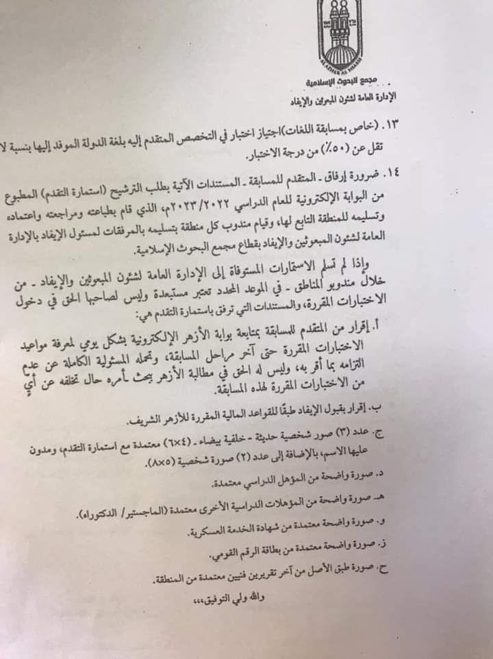كما أنه على المتقدم تقديم طلب الترشيح (استمارة التقدم) المطبوعة من البوابة الإلكترونية للعام الدراسي 2022/2023م، بعد طباعته ومراجعته واعتماده وتسليمه للمنطقة التابع لها، وقيام مندوب كل منطقة بتسليمه بالمرفقات لمسئول الإيفاد بالإدارة العامة لشئون المبعوثين والإيفاد بقطاع مجمع البحوث الإسلامية؛ حيث تسلم الاستمارات المستوفاة إلى الإدارة العامة لشئون المبعوثين والإيفاد ـ من خلال مندوبو المناطق ـ في الموعد المحدد، ويرفق معها: إقرار من المتقدم للمسابقة بمتابعة بوابة الأزهر الإلكترونية بشكل يومي لمعرفة مواعيد الاختبارات المقررة حتى آخر مراحل المسابقة، وتحمله المسئولية الكاملة عن عدم التزامه بما أقر به، وليس له الحق في مطالبة الأزهر ببحث أمره حال تخلفه عن أيٍّ من الاختبارات المقررة لهذه المسابقة، إقرار بقبول الإيفاد طبقًا للقواعد المالية المقررة للأزهر الشريف، عدد (3) صور شخصية حديثة ـ خلفية بيضاء ـ (4×6) معتمدة مع استمارة التقدم، ومدون عليها الاسم، بالإضافة إلى عدد (2) صورة شخصية (5×8)، صورة واضحة من المؤهل الدراسي معتمدة، صورة واضحة من المؤهلات الدراسية الأخرى معتمدة (الماجستير/ الدكتوراة)، صورة واضحة معتمدة من شهادة الخدمة العسكرية، صورة واضحة معتمدة من بطاقة الرقم القومي، صورة طبق الأصل من آخر تقريرين فنيين معتمدة من المنطقة.