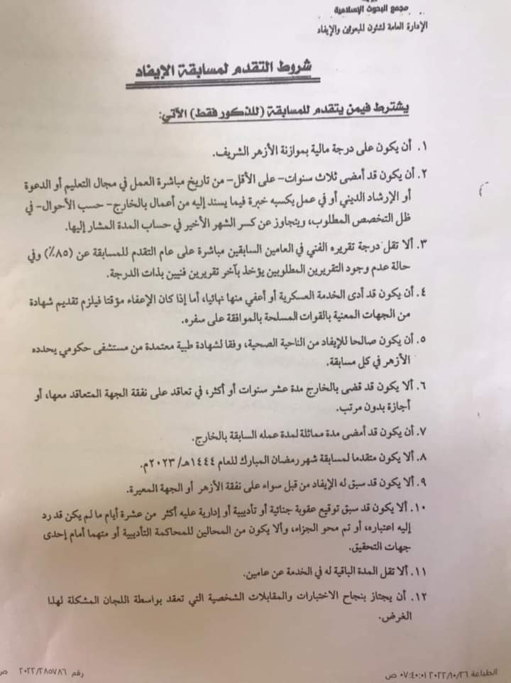 كما يشترط فيمن يتقدم للمسابقة: أن يكون على درجة مالية بموازنة الأزهر الشريف، وأن يكون قد أمضى ثلاث سنوات- على الأقل- من تاريخ مباشرة العمل في مجال التعليم أو الدعوة أو الإرشاد الديني أو في عمل يكسبه خبرة فيما يسند إليه من أعمال بالخارج- حسب الأحوال- في ظل التخصص المطلوب، ويتجاوز عن كسر الشهر الأخير في حساب المدة المشار إليها، ألا تقل درجة تقريره الفني في العامين السابقين مباشرة على عام التقدم للمسابقة عن (85٪) وفي حالة عدم وجود التقريرين المطلوبين يؤخذ بآخر تقريرين فنيين بذات الدرجة، أن يكون قد أدى الخدمة العسكرية أو أعفي منها نهائيًا، أما إذا كان الإعفاء مؤقتًا فيلزم تقديم شهادة من الجهات المعنية بالقوات المسلحة بالموافقة على سفره، أن يكون صالحًا للإيفاد من الناحية الصحية، وفقًا لشهادة طبية معتمدة من مستشفى حكومي يحدده الأزهر في كل مسابقة، ألا يكون قد قضى بالخارج مدة عشر سنوات أو أكثر، في تعاقد على نفقة الجهة المتعاقد معها، أو إجازة بدون مرتب، وأن يكون قد أمضى مدة مماثلة لمدة عمله السابقة بالخارج، ألا يكون متقدمًا لمسابقة شهر رمضان المبارك للعام 1444هـ/2023م، ألا يكون قد سبق له الإيفاد من قبل سواء على نفقة الأزهر أو الجهة المعيرة، ألا يكون قد سبق توقيع عقوبة جنائية أو تأديبية أو إدارية عليه أكثر من عشرة أيام ما لم يكن قد رُدَّ إليه اعتباره، أو تم محو الجزاء، وألا يكون من المحالين للمحاكمة التأديبية أو متهمًا أمام إحدى جهات التحقيق، ألا تقل المدة الباقية له في الخدمة عن عامين، أن يجتاز بنجاح الاختبارات والمقابلات الشخصية التي تعقد بواسطة اللجان المشكلة لهذا الغرض، ويشترط في مسابقة اللغات اجتياز اختبار في التخصص المتقدم إليه بلغة الدولة الموفد إليها بنسبة لا تقل عن (50٪) من درجة الاختبار.