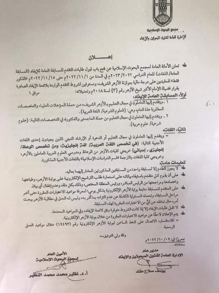 وكانت الأمانة العامة لمجمع البحوث الإسلامية بالأزهر الشريف أعلنت عن فتح باب قبول طلبات التقدم للمسابقة العامة للإيفاد للعام الدراسي 2022/2023م بداية من أول من نوفمبر القادم ولمدة أسبوعين.