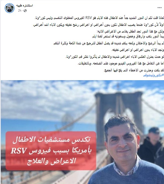 وكتب الدكتور وليد شوقي تدوينة عبر صفحته بالفيس بوك "لماذا قلت لكم ان الدور الشديد جدًا عند الاطفال هذه الأيام هو RSV الفيروس المخلوي التنفسي وليس كورونا. اولًا لأن كورونا عندما يصيب الأطفال تكون بدون أعراض أو أعراض رشح خفيفة ويكون الآباء أشد أعراض."